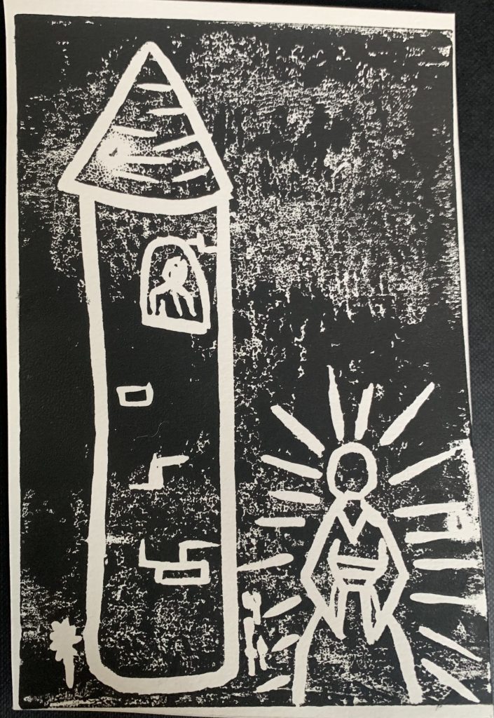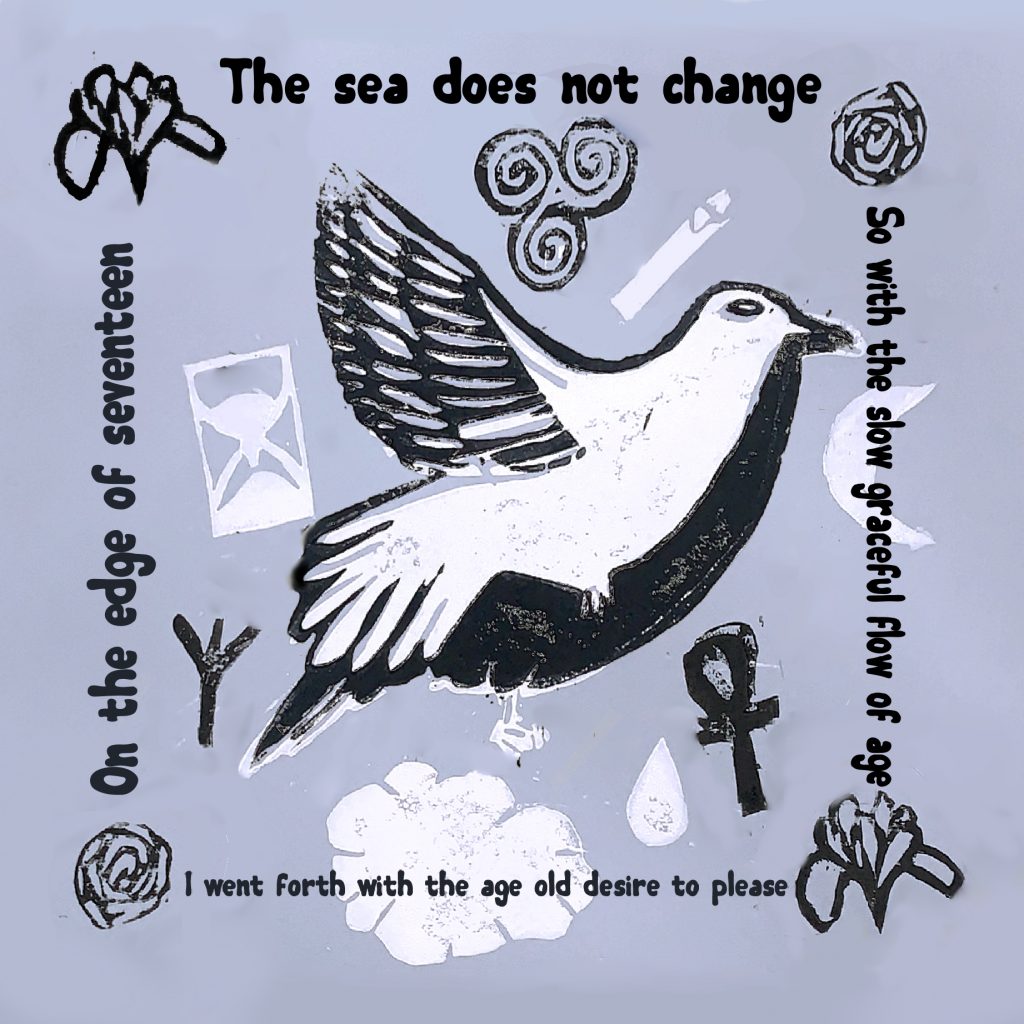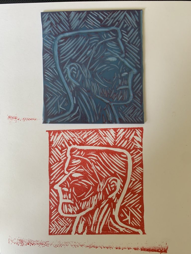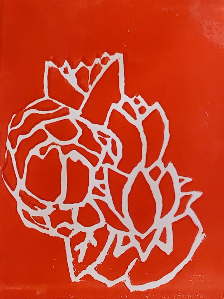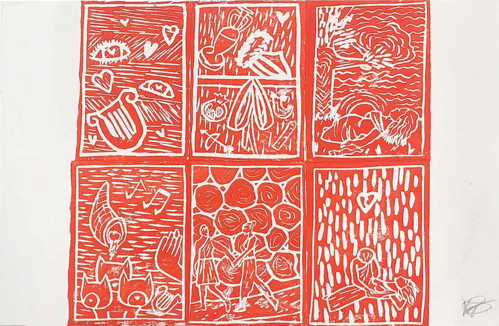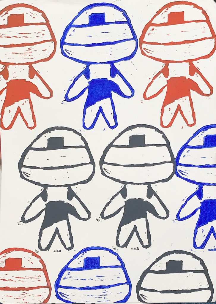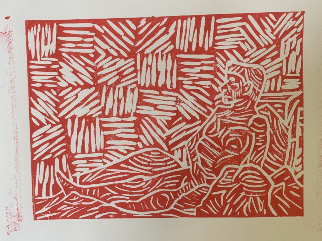 A collection of my various lino prints including, a collection of flower-inspired stamps and prints (top left middle and right and third right), Formula 1 Racesuit pattern (second row left), prints inspired by the Korean story of the Smeraldo flower (second-row middle and left), prints made during life drawing sessions (third left and fourth right), a series of prints telling the story of Orpheus and Eurydice (fourth left), and finally a print based on the song ‘The Edge of Seventeen’ by Stevie Nicks (bottom).